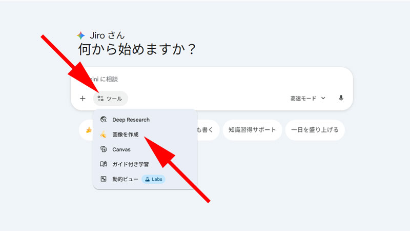 Geminiの場合は、最初にプロンプトボックス内にある「ツール」をクリックします。メニューが表示されますので、「画像を作成」を選択します。