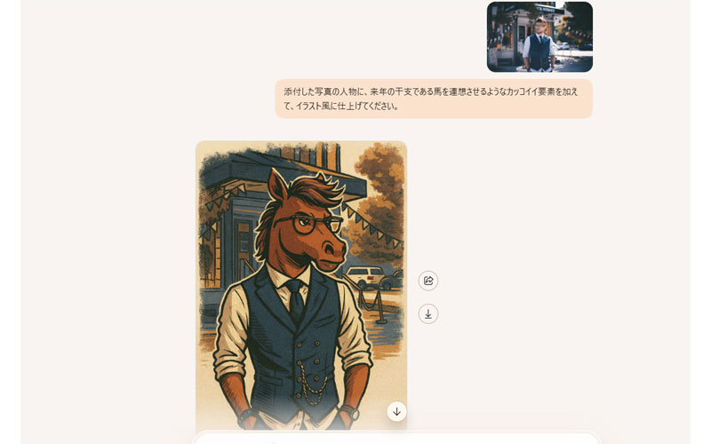 プロンプトに、「添付した写真の人物に、来年の干支である馬を連想させるようなカッコイイ要素を加えて、イラスト風に仕上げてください。」と入力してみます。