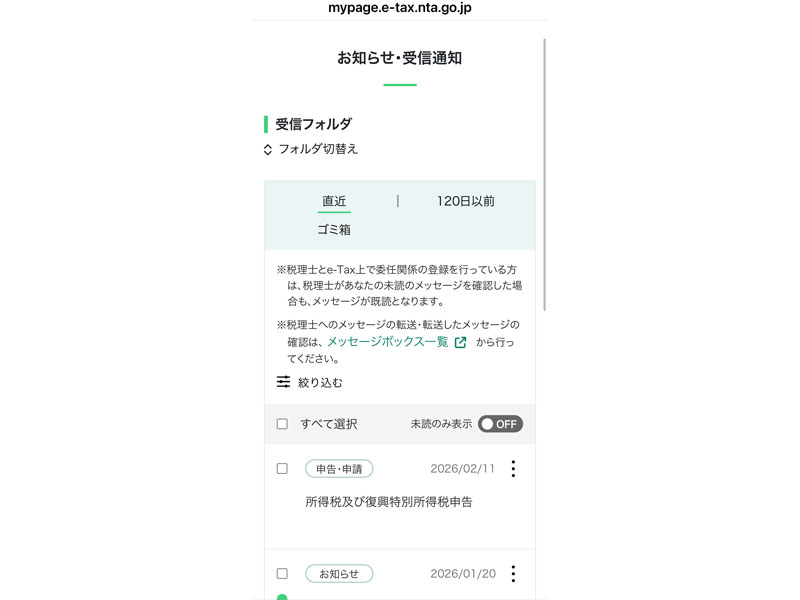 上部に「国税還付金振込通知書に、未読のメッセージがあります。」と表示されているのを確認してください。